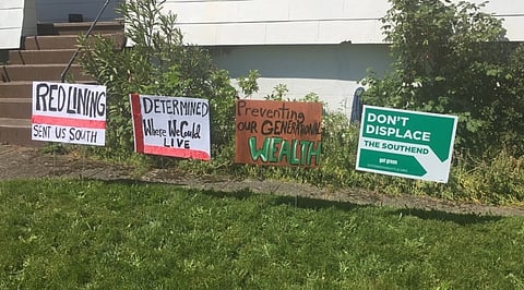 My house doesn't stand out much, but my lawn signs are like a loud middle finger — "Redlining sent us south" or "Don't displace the South End." When I first put them up I noticed people slowing down their cars to read them. One lady rolled down her car window to explain herself. It seemed like she was hoping to engage in a longer conversation, but I let the signs speak for themselves. Now I'm ready to say what's on my mind.