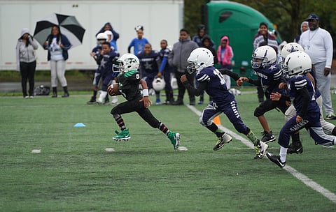 There are 12 teams in the league, and five age groups: Rookies (ages 6 and under), Freshman (ages 8 and under), Sophomores (ages 10 and under), Juniors (ages 12 and under), and Seniors (ages 14 and under). The families of the kids who play in the league spend at least one day every weekend from the end of August through November watching football.
