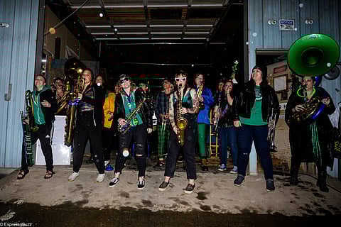 Featured Image: Filthy FemCorps, a women and nonbinary brass band, performing at 2022 HONK! Fest West. (Photo: EspressoBuzz Photography)