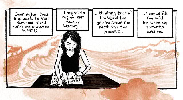 Thi Bui: I feel like they talk about it less now. It's interesting because then we had a focused place to put the story. For a while I was having lots of really intense conversations with my parents, and we were able to do that because it was for a project and it wasn't just, you know, for fun — and those conversations aren't really fun; they're pretty intense. Now that it's done, I think that, at first, my parents were used to not talking about that stuff anymore, so they sort of kept going and I had to be, like, "Oh my god, don't tell me anymore. I can't put any more in. It's gone to print." I feel like it's archived now, like people in the family are satisfied that our story is archived and that it's been about coming to terms with the fact that no archive can say everything, no story tells all the stories within it. For being nonfiction, it took this small slice of what happened.