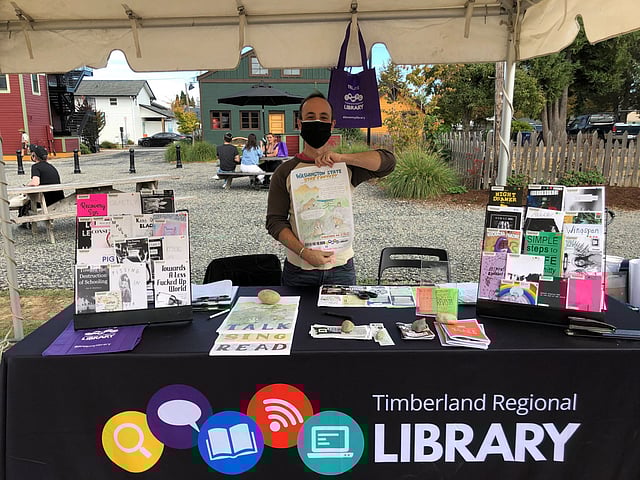 Featured Image: Chris Sabatini of the Olympia Timberland Library holds the poster he designed for this year's zine contest. Taken at the Lil' Olympia Zine Fest in 2021. Photo courtesy of Washington Center for the Book.