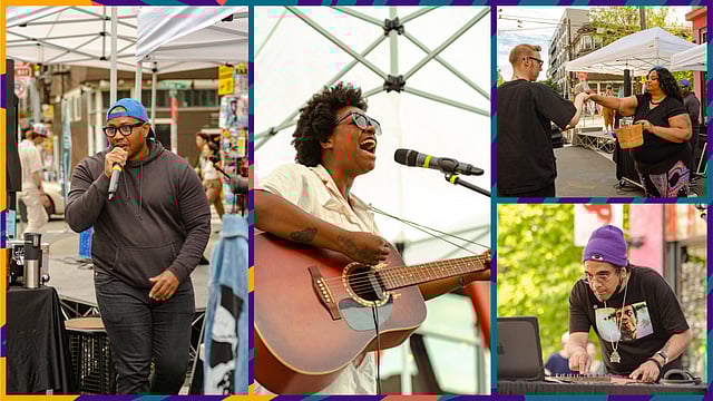 Featured Image: Some scenes from On the Block: DJ and producer cljlamar (left), singer and songwriter Maya Marie (center), resident artist and event volunteer Nya (upper right), and beatmaker and audio producer Third Eye Bling (lower right). (Photos by Luis Orozco of exthindvisuals, courtesy of On the Block.)