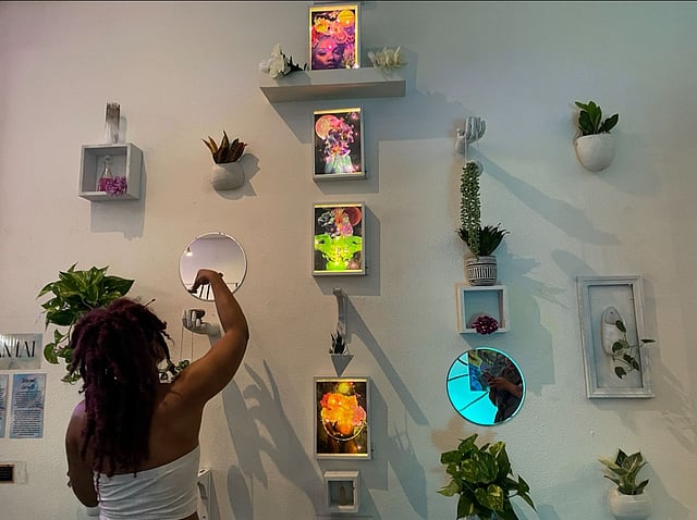 For the inaugural September edition, there were interesting shows sprinkled throughout the Central District. At Made Space, AMAI and Edimbo Lekea’s collaborative exhibition DIVINE featured vibrant paintings, plants, mirrors, and flowery collages on small light boxes (Morales notes that by night’s end, almost the entire show sold out). While an exhibition was still under construction at Arte Noir (but had FREE banana pudding courtesy of The Sugah Shack), Wa Na Wari opened its doors for people to check out its excellent suite of artists currently up. And over at Central Cafe, painter Jayda had a show of intuitive abstract paintings and drawings that explored trauma, healing, sexuality, and rebirth.