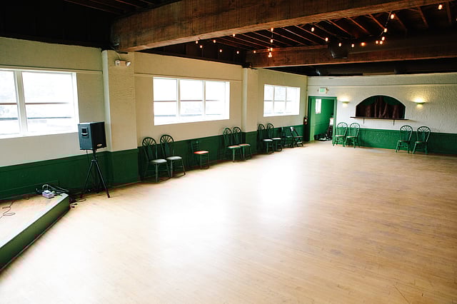 The large second-floor space now features exposed timber beams and windows overlooking the heart of South Park's tiny commercial district. An assemblage of green chairs faces a small stage, and a pair of brown leather sectional couches flanks the room. In one corner there's a bar and in the opposite corner, there's a kitchen with a service window. The overall vibe is shabby chic simplicity; it's the type of place where your chill friends would throw their wedding reception or album release party.