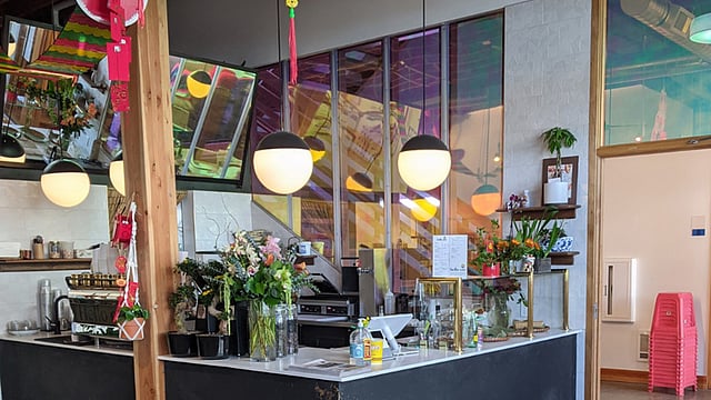 The Little Saigon Creative space is a community hub with offices and meeting spaces. A focal point of the space on the central wall features a visual history of Little Saigon and a map of Vietnam, showing where Hello Em sources their coffee beans. To the right of these installations is an art gallery, featuring the artwork of local artists in "Owning It," Little Saigon Creative's first exhibit.
