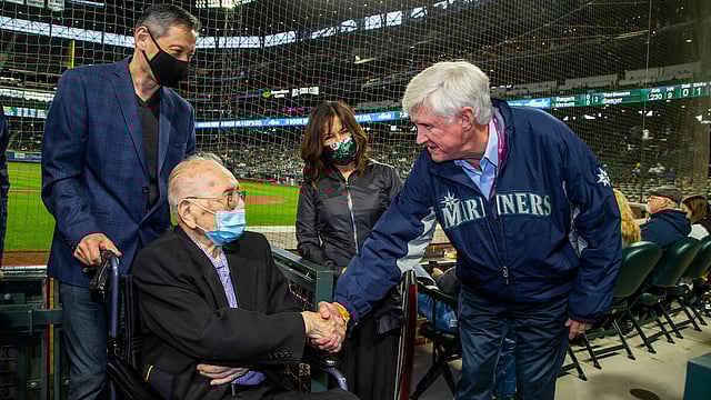 📸 Featured Image: Mariners Chairman and Managing Partner John Stanton shakes Gene Moy's hand at the Mariners' Asian American Pacific Islander Heritage Night. (Photo by Ben VanHouten/Seattle Mariners.)