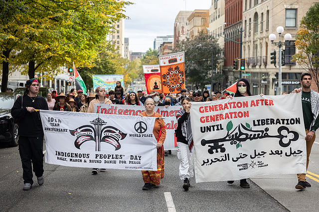 Indigenous and Palestinian activists march side by side as the connection between Palestinian resistance and Indigenous Peoples' Day was drawn by speakers and signs during Seattle's 10th Indigenous Peoples' Day Celebration on Oct. 14, 2024. (Photo: Alex Garland)