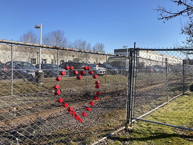 Featured image: A heart of plastic cups was installed in the fence outside the Northwest Detention Center in Tacoma on Thursday. (Photo by Paula Cornell).