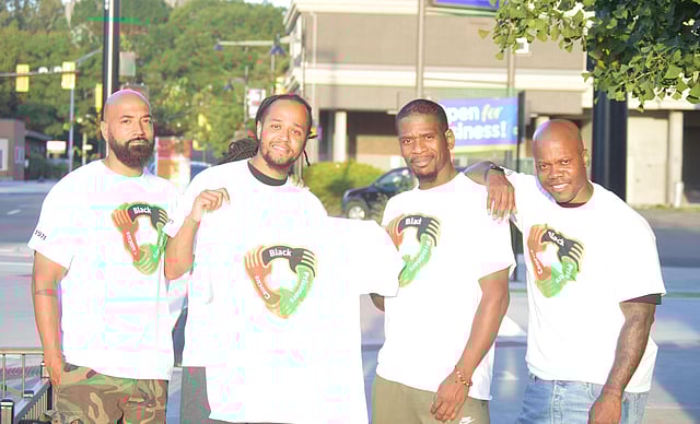 Featured Image: From left: Devon Adams, Brandon Pedro, Faraji Bhakti, and Kimonti Carter hold up an empty BPC T-shirt representing the hundreds of BPC members still incarcerated. (Photo: Keys)