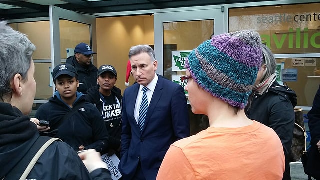 Outside the Pavillion, Constantine met with protestors in a somewhat contentious exchange that served as a highlight reel of the enduring differences between King County and the No New Youth Jail Coalition since voters approved a tax levy to fund the Center in 2012.