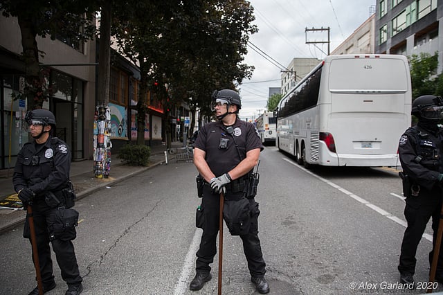 Featured image: A police officer stands in the street at a protest on Capitol Hill in Seattle, Washington, on June 2, 2020. (Photo: Alex Garland)