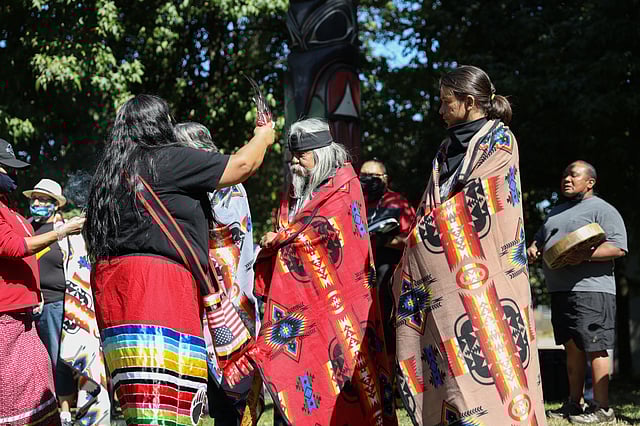 At 5 p.m. Eagleson led a march away from the memorial totem pole and toward the intersection of Boren and Howell, where John T. Williams was shot and killed in 2010. In addition to drumming and singing, the march included chants of, "Whose lives matter? Black and Indegenous!" and, "No justice! No peace! No racist police!" among many others.