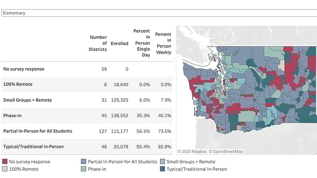 Featured Image: Still image of a Washington Office of Superintendent of Public Instruction interactive map of Washington state's current school reopening data.