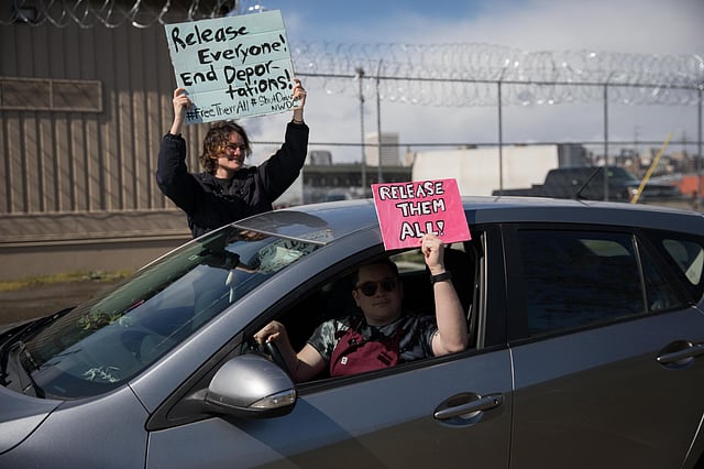 Featured Image: Demonstrators holds signs at a March 30, 2020, rally in solidarity with those incarcerated at the now Northwest ICE Processing Center (formerly Northwest Detention Center) in Tacoma, WA. (Photo: Alex Garland)