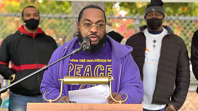 📸 Featured Image: With other members of the Regional Peacekeepers Collective, Saleem Robinson, founder and executive director of Renegades for Life, discusses the coalition's public health approach that brings together a wide range of services to address the root causes of gun violence. (Photo: Malu Santos)