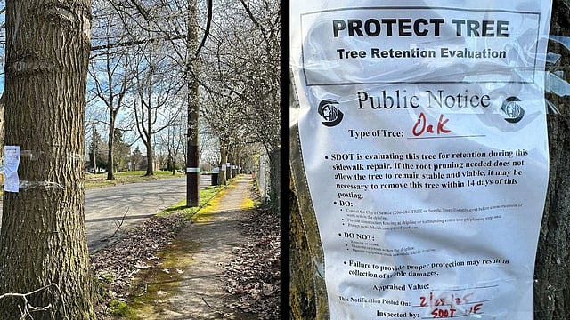 Tree advocates are concerned about the notices for potential removal of 67 street trees along a five-block stretch on the east and west sides of Beacon Avenue South between South Juneau Street and South Monterey Place. Notices were posted on each of these trees, denoting that they're being evaluated for retention due to two Seattle Department of Transportation (SDOT) projects that will repair damaged sidewalks. The notice indicates that the trees may be removed within 14 days of the posting. Many notices have dates of Feb. 23 and Feb. 25, meaning removal could happen between now and as soon as March 11. Other notices don't include the required date of posting.