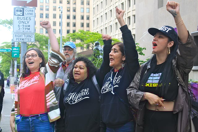 There, she spoke about the details of her case, and invited everyone to her second deportation hearing, which was initially scheduled that day, only to be rescheduled for June 26. She also announced the launch of Chinga La Migra, a multi-city organizing tour and web docu-series organized by Mijente, which kicked off in Tacoma on Monday, June 4, with a noise demonstration at the Northwest Detention Center – a privately run immigration prison located in Tacoma -and site of over a dozen hunger strikes in the last three years.