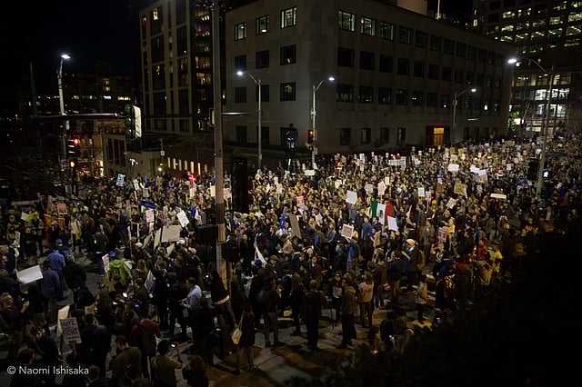 Thousands of people turned out to protest President-elect Donald Trump in downtown Seattle on Wednesday night. The demonstration was one of several that took place in cities nationwide to demonstrate against Trump's election.