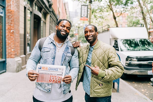 📸 Featured Image: Robert Turbin (left) and Marcus Harrison Green (right) share the love from outside the Real Change offices on First Avenue South. (Photo: Nikki Barron, courtesy of Real Change)