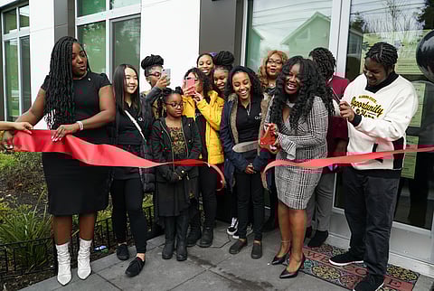 Featured image: Family, friends, and some of the young women who participate in the Young Queens program join Monika Mathews, owner of QueenCare, center right, as she cuts the ribbon at the opening of her new Columbia City store in Seattle, Washington, on Dec. 8, 2018. (Photo: Susan Fried)