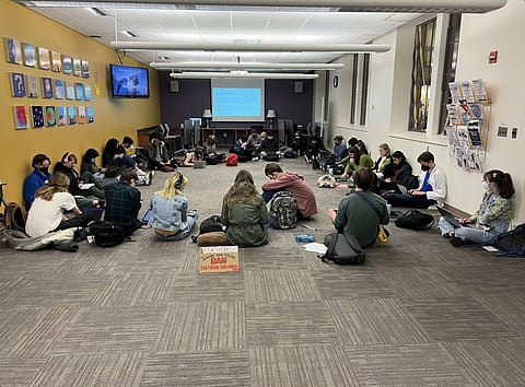 As part of its Demand 5, the ICA held sit-ins every weekday for seven weeks, from 3:30 to 5 p.m., to hold the UW Career Center accountable for allowing fossil fuel companies to utilize its services. Throughout the sit-ins, you'd find ICA members and participants gathered in a large circle at the UW Career Center in complete silence, due to a quiet rule applied after the career center's executive director filed a student misconduct report for noise.